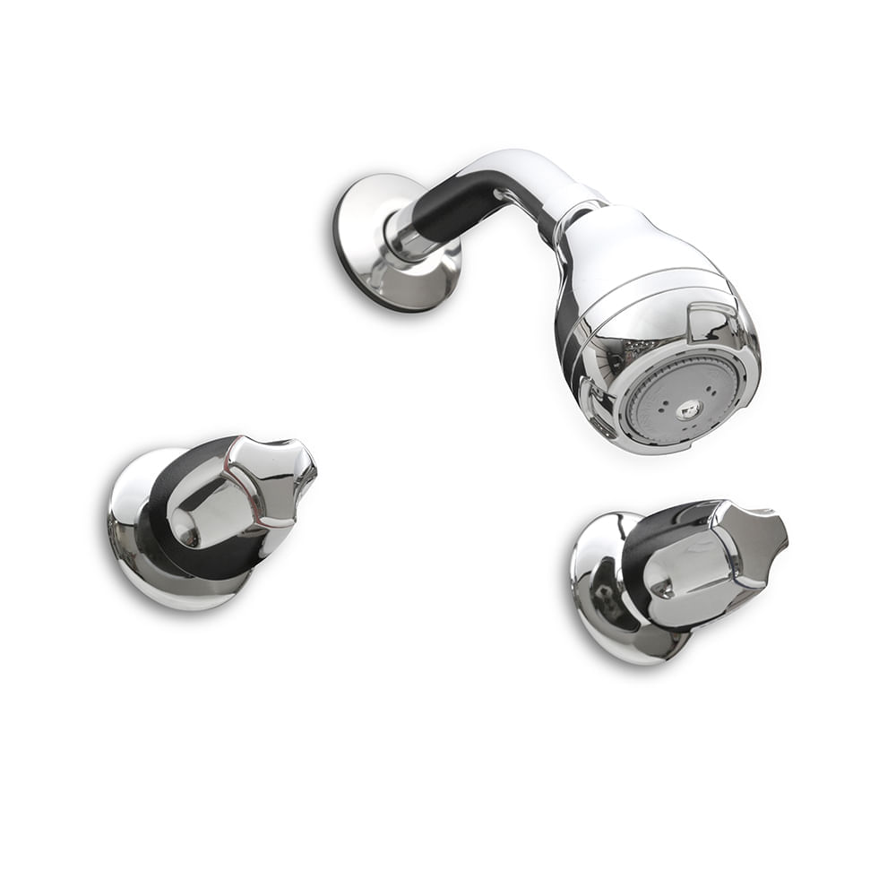 | Características | Llave mezcladora para ducha convencional de cuerpo interior de Bronce con acabado cromado en el exterior, con salida de ducha hecho de Bronce con cabezal de plástico ABS de 2 tipos de chorro (Massage y Spray), sistema de cierre disco cerámico o 1/4 de giro de larga duración. Altamente resistente a la corrosión. Viene con perillas de Bronce cromado con diseño convencional. Distancia entre perillas: 8". Movimiento de cabezal 45° |