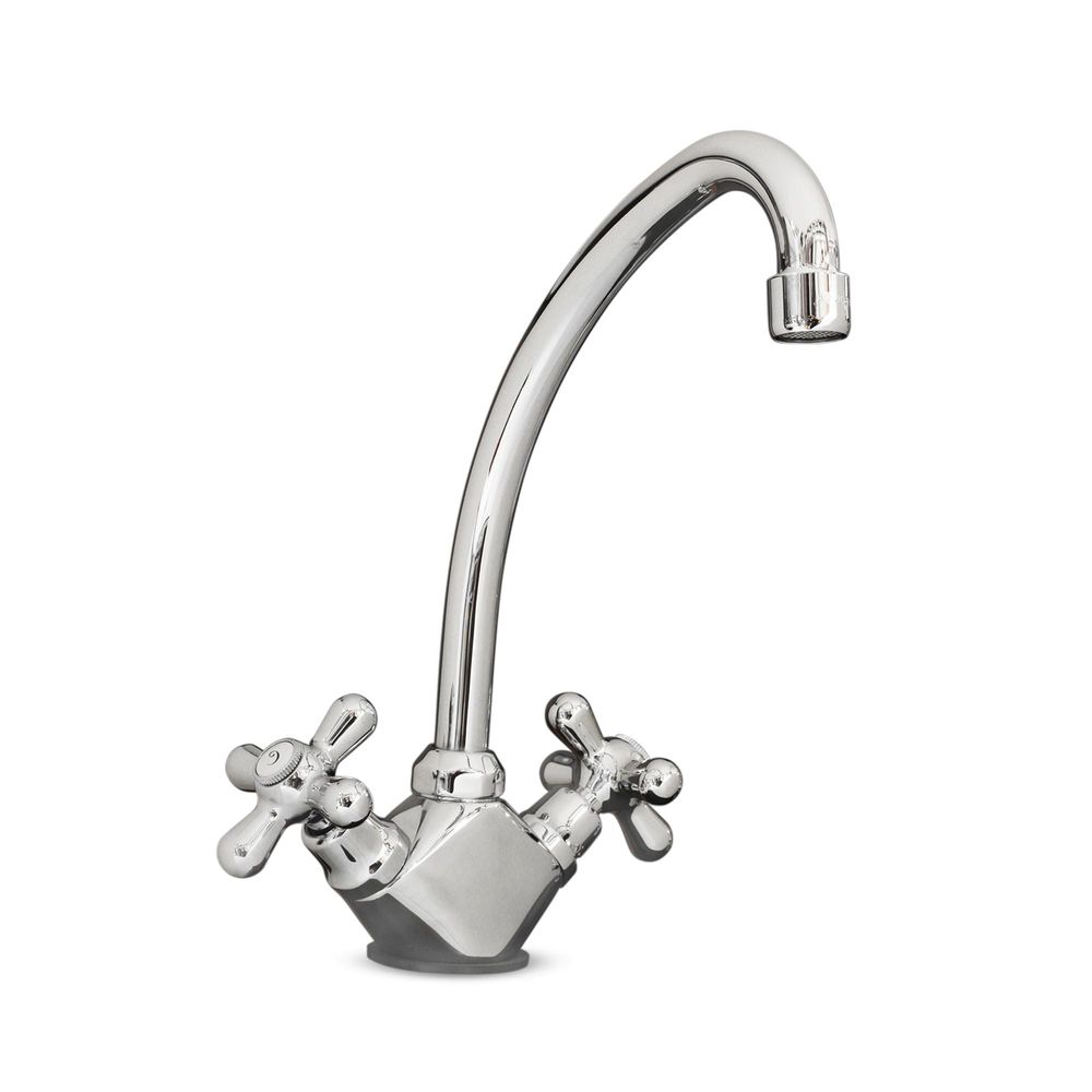 | Características | Grifería mezcladora de 2 perillas de bronce en acabado cromado, sistema de cierre 1/4 de giro con disco cerámico resistente a la corrosión. Viene con Areador desmontable en el cabezal de la grifería, perilla de bronce con diseño anatómico de fácil agarre. Pico giratorio tipo ganso. |