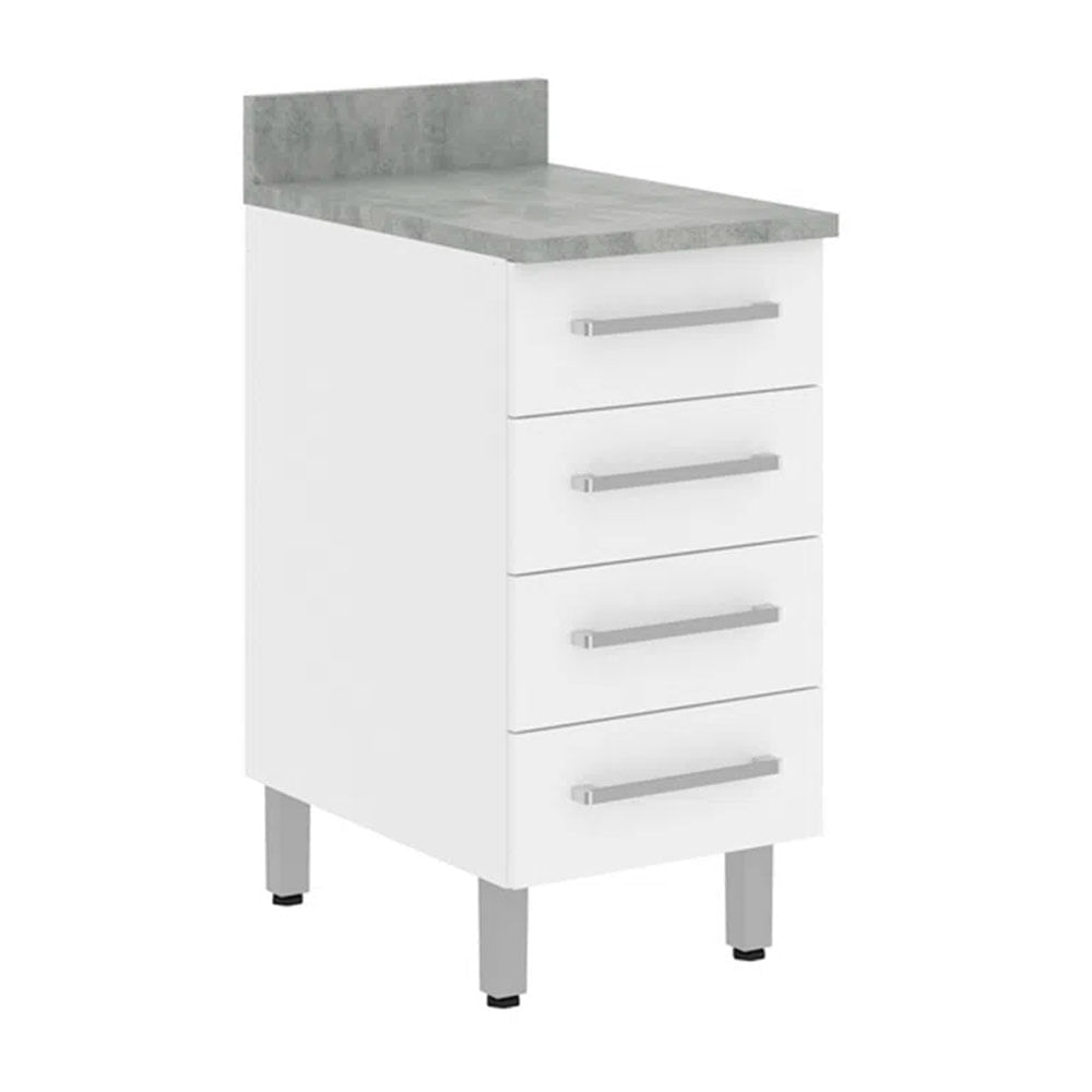 | Características | Mueble de estructura MDP 15mm con revestimiento en pintura UV color Blanco, patas de PVC cromada, el mueble incluye tablero de MDP de 25 mm de espesor revestido en papel melamínico, incluye zócalo para mesada de 12.5 cm de altura, para la parte trasera viene con fondo de MDF revestido en pintura UV de color blanco en una cara. 4 Cajones de MDP de 15 mm de espesor con base de MDF de 3mm color blanco, correderas simples de acero. |