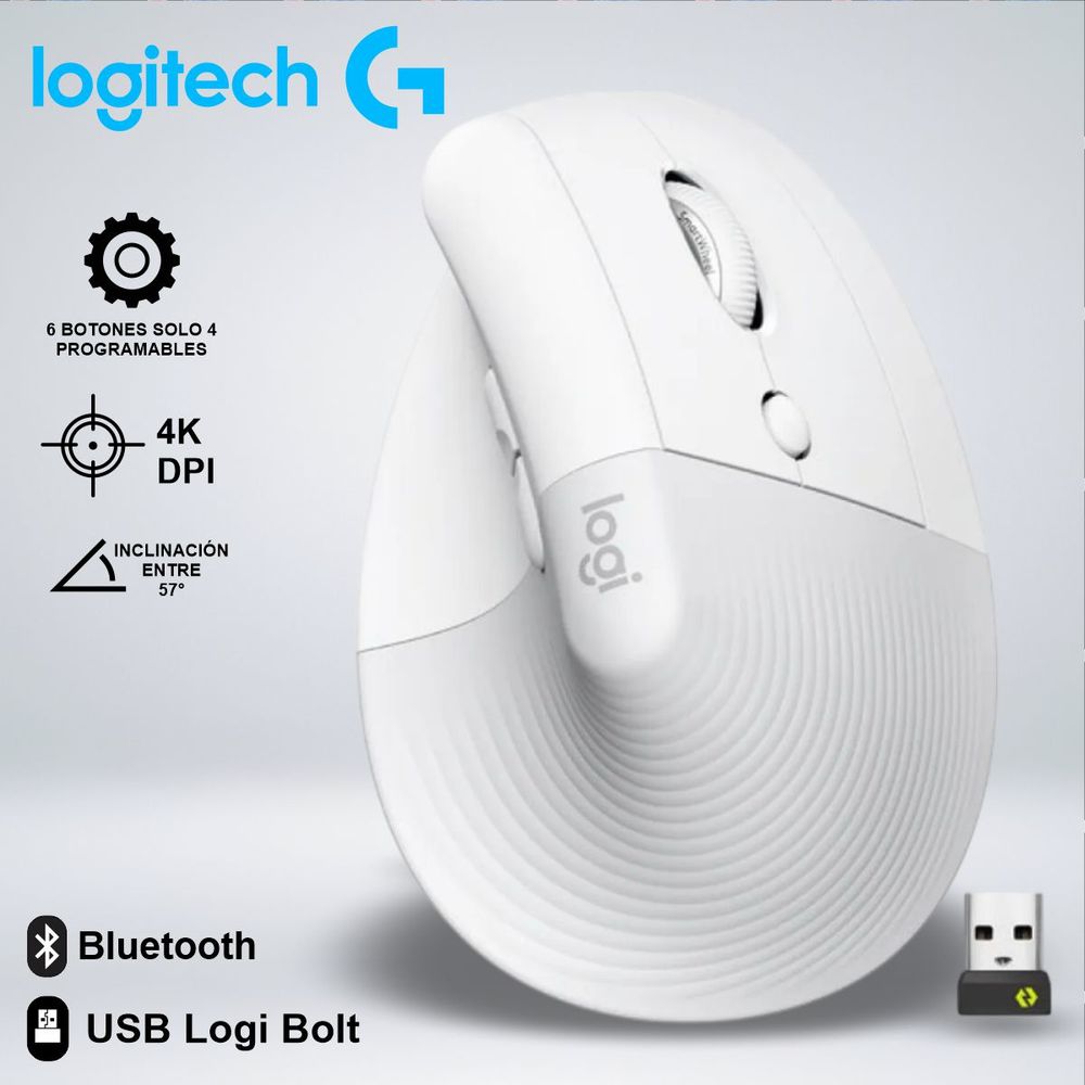 MOUSE LOGITECH LIFT VERTICAL WIRELESSBLUETOOTH COMODIDAD ANGULO 57 GRADOS BLANCO