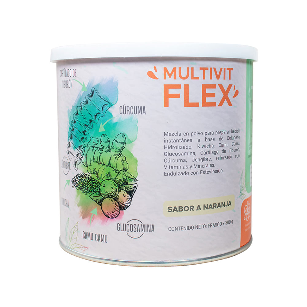 | Características | Complemento a base de Colágeno Hidrolizado, Kiwicha, Glucosamina, Cartílago de Tiburón, Cúrcuma, Jengibre, Camu Camu, Vitamina C, A, E, B6, Zinc, Magnesio, endulzado con Steviósido, sabor Naranja. |