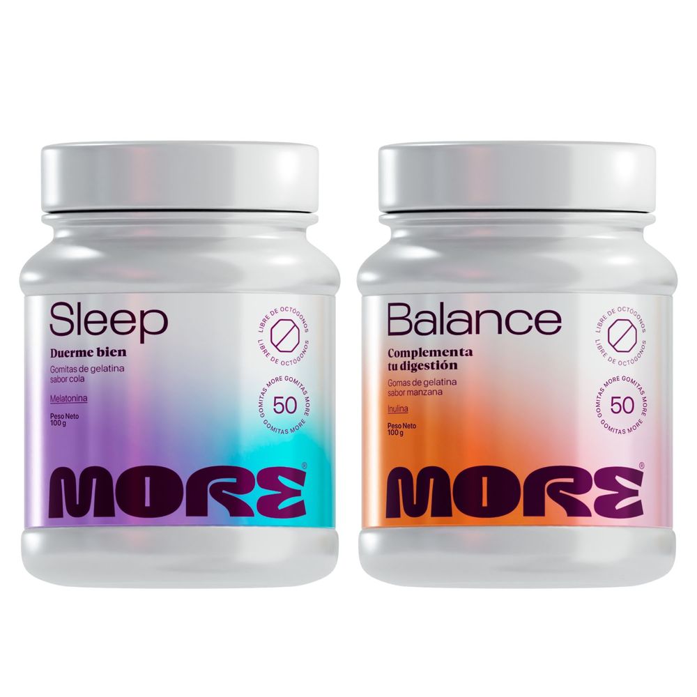 | Características | MELATONINA GOMITAS MORE SLEEP 50UND 100G COLA , • Relaja el sistema nervioso. , • Alivia el insomnio y restaura el ciclo del sueño. , • Favorece el descanso profundo. , • Menos de 0.5g de azúcar por porción , • Libre de Gluten, libre de GMO, libre de Lactosa , • 50 gomitas | 25 tomas , • Dosis diaria de 2 gomitas , , FIBRA PREBIÓTICA GOMITAS MORE BALANCE 50UND 100G MANZANA , • Promueve una buena digestión. , • Potencia la eliminación de toxinas. , • Limpia, calma y desinflama el abdomen. , • Menos de 0.5g de azúcar por porción , • Libre de Gluten, libre de GMO, libre de Lactosa , • 50 gomitas | 25 tomas , • Dosis diaria de 2 gomitas |