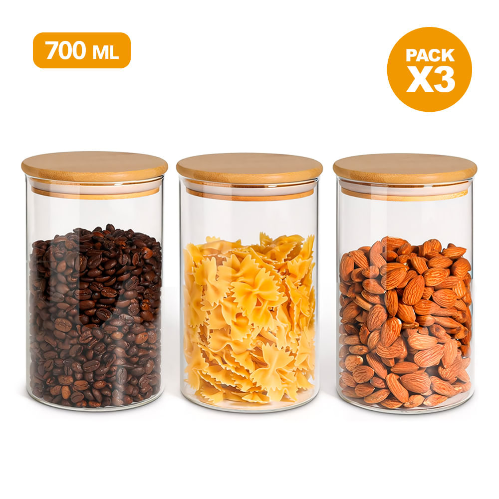 Pack x3 Frascos de Vidrio Hermético con Tapa de Bambú 700 ML FV5