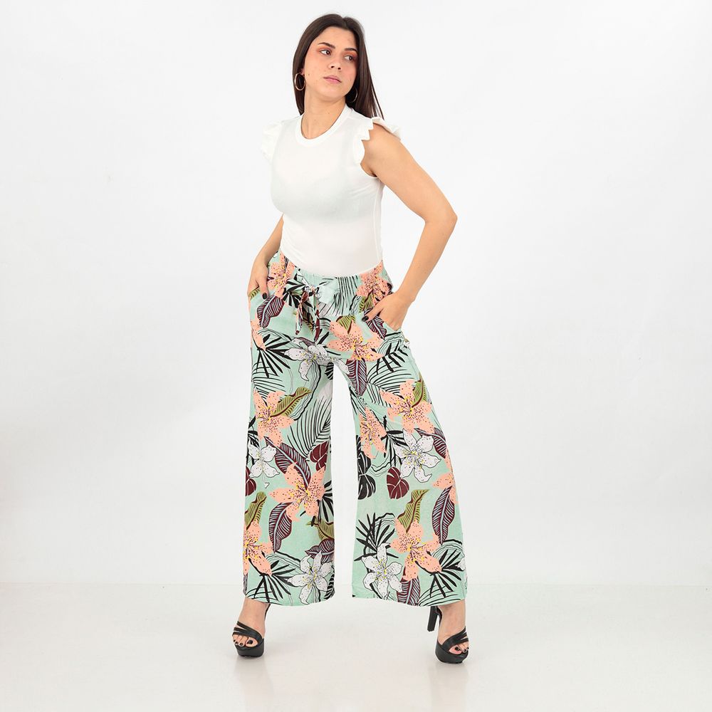 Pantalón Palazzo Floreado Acampanado Mujer Color Celeste