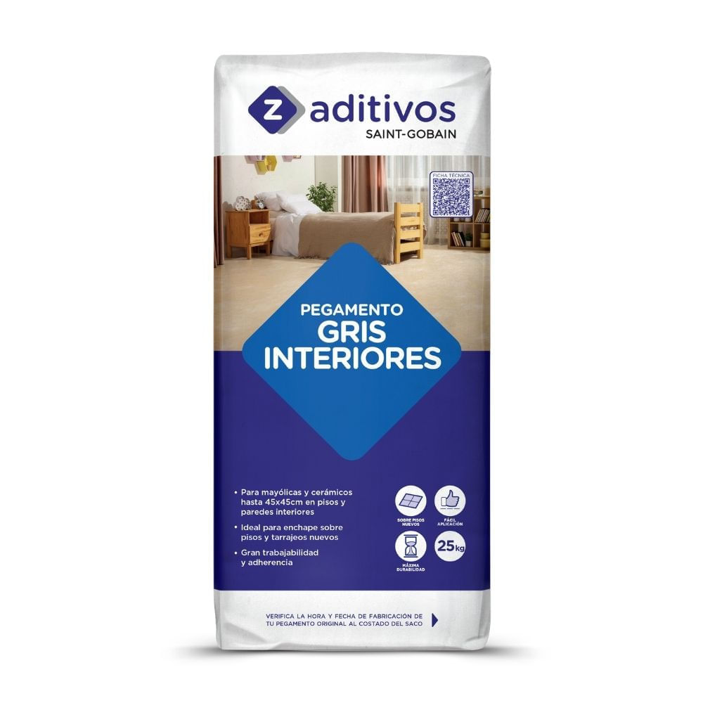 | Observaciones | Pegamento gris cementicio para enchape de cerámicos, mayólicas y azulejos. Z Aditivos gris interiores es un pegamento en polvo a base de cemento gris, agregados seleccionados y aditivos sintéticos, diseñado para la instalación de revestimientos cerámicos en soportes nuevos, ofreciendo una alta capacidad de adherencia. |