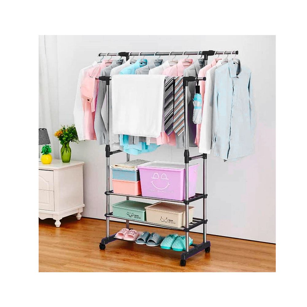 | Características | Colgador Doble para ropa y 3 pisos para colocar zapatos, cajas, etc. La base viene con ruedas para que se pueda trasladar donde deseen, su color aluminio y negro lo hacen un producto muy bonito para dormitorio o negocio y tener sus cosas super ordenadas |