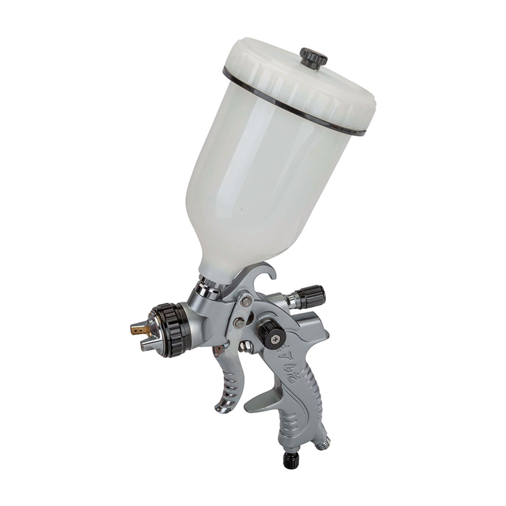 | Características | Pistola para pintar HVLP. Presión ajustable, ancho de la manga ajustable y flujo de pintura ajustable. Volumen de la copa de plástico: 0,55 L |