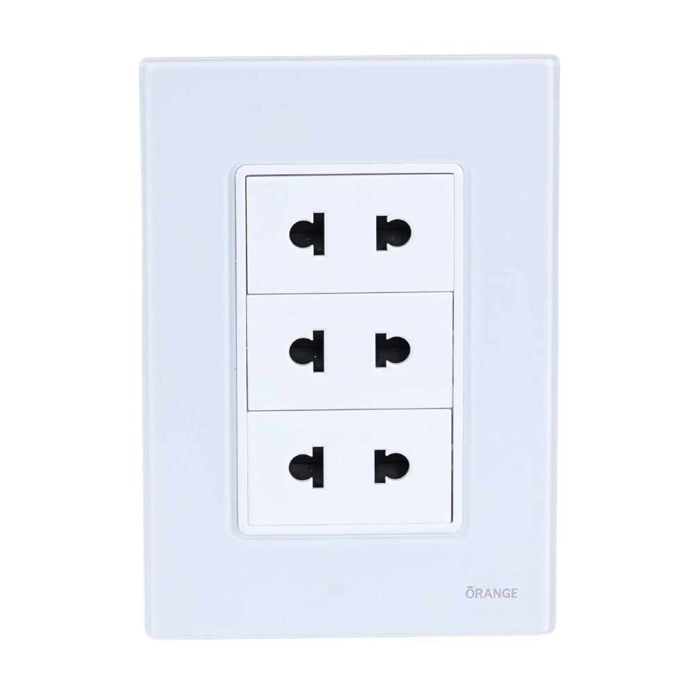 | Características | Placa tomacorriente universal triple, tipo empotrable para instalaciones domésticas de uso interno. Además tiene bornes con doble agujero para derivaciones. |