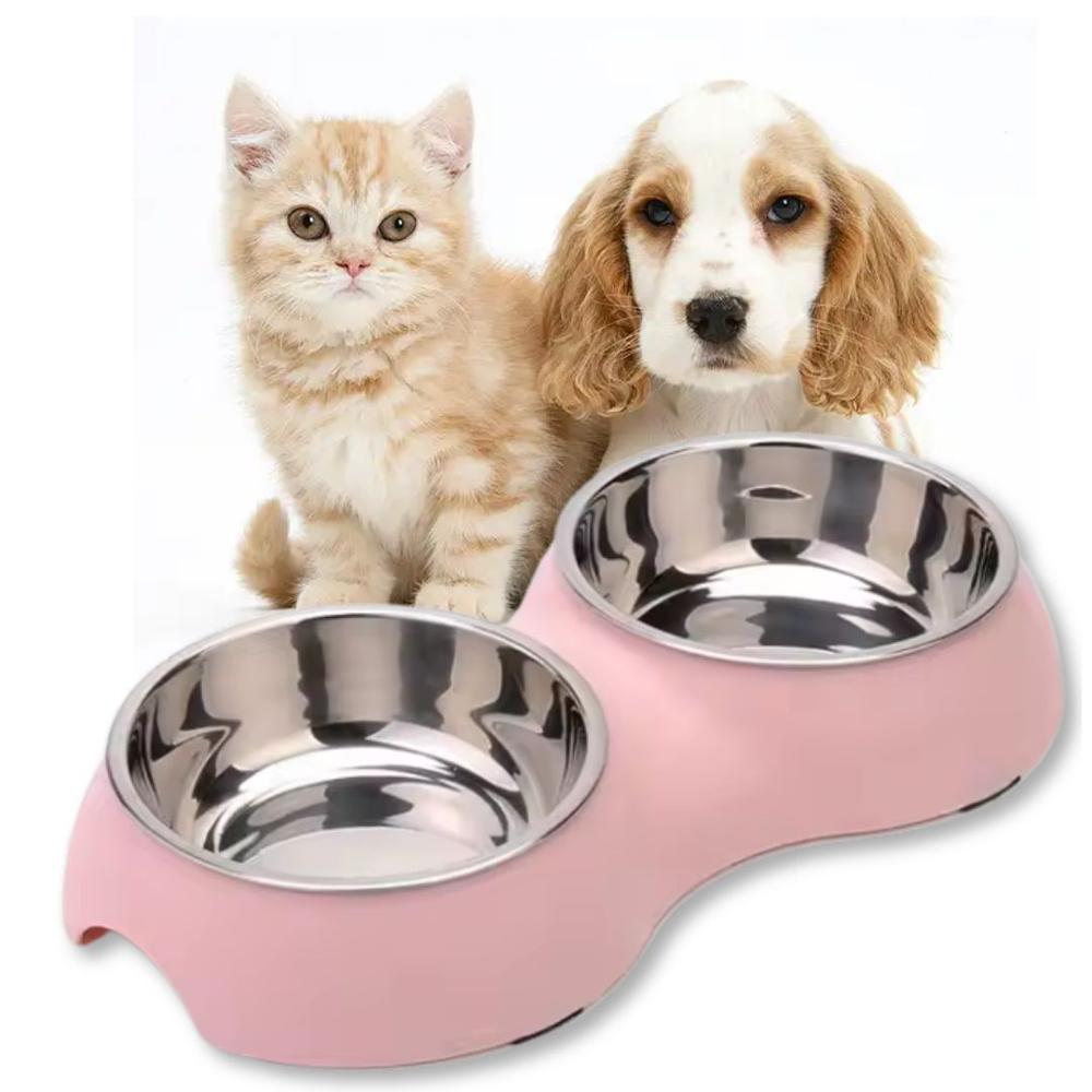 Plato con Doble Cuento para Mascota Comedero Bebedero Perros y Gatos Rosado