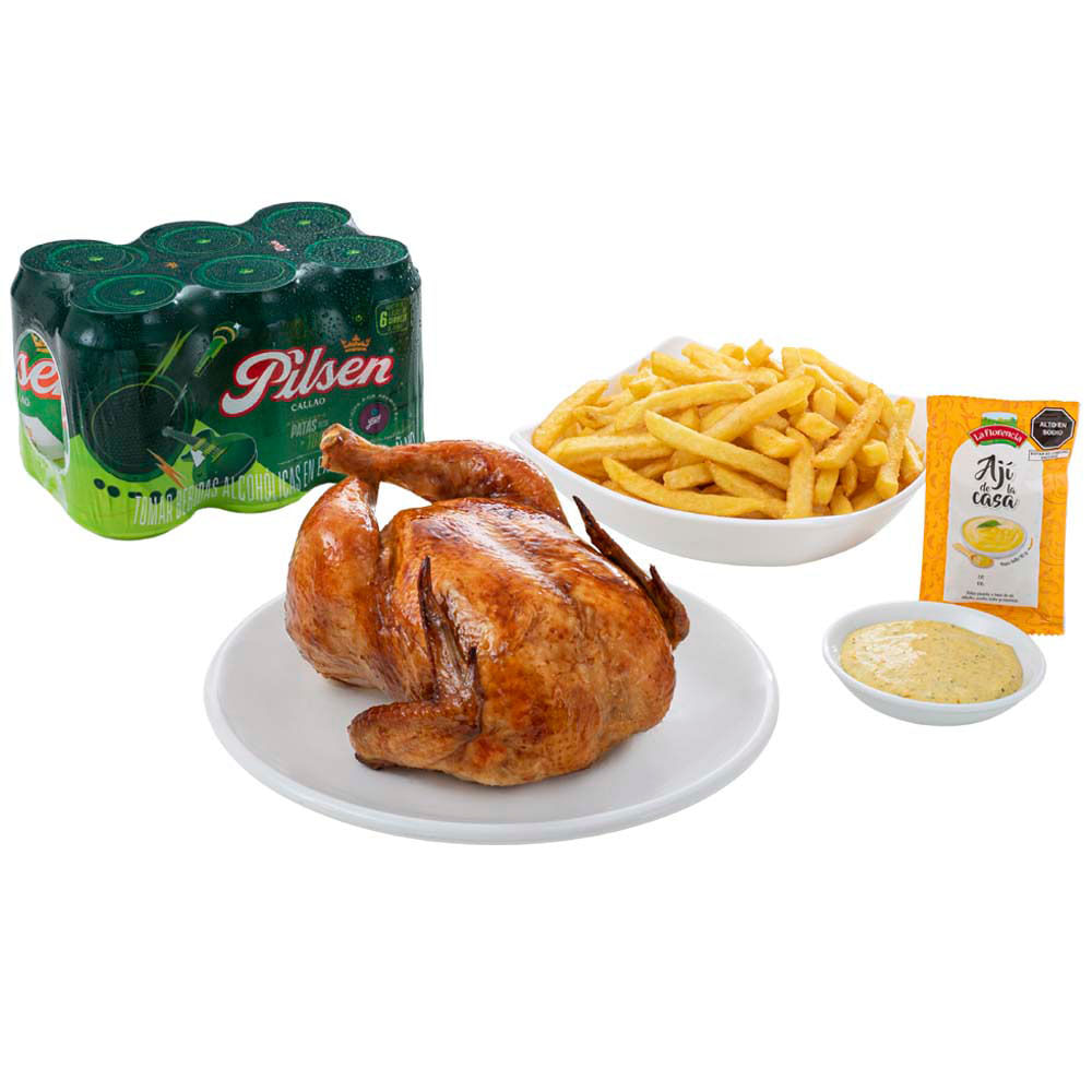 Combo Pollo Rostizado + Papas Fritas + PILSEN Six Pack 355ml