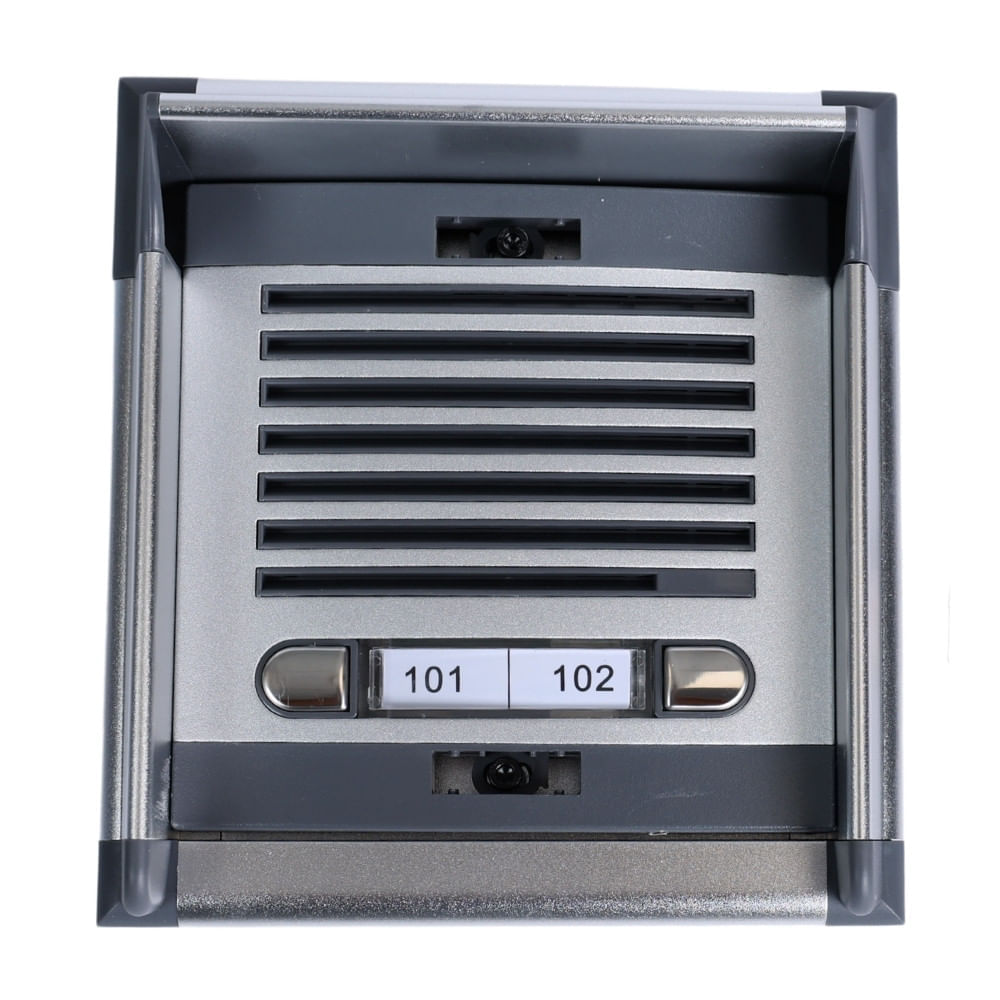| Características | Tiene porta etiquetas enumeradas para cada piso, 2 pulsadores analógicos, utiliza fuente a 12v para la conexión,distancia máxima de instalación del portero a la fuente 150 mts y de la fuente al intercom 100 mts. |