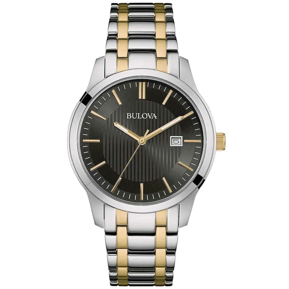 Reloj Bulova 98B237 para Hombre Fecha Acero Inoxidable Plateado Dorado Dial Negro