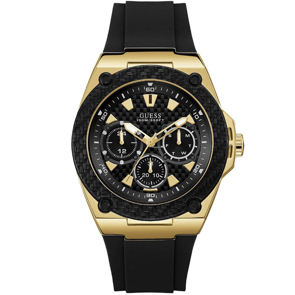 Reloj Guess Legacy U1049G5 Multifuncional Acero Inoxidable Dorado Correa de Silicona Negro