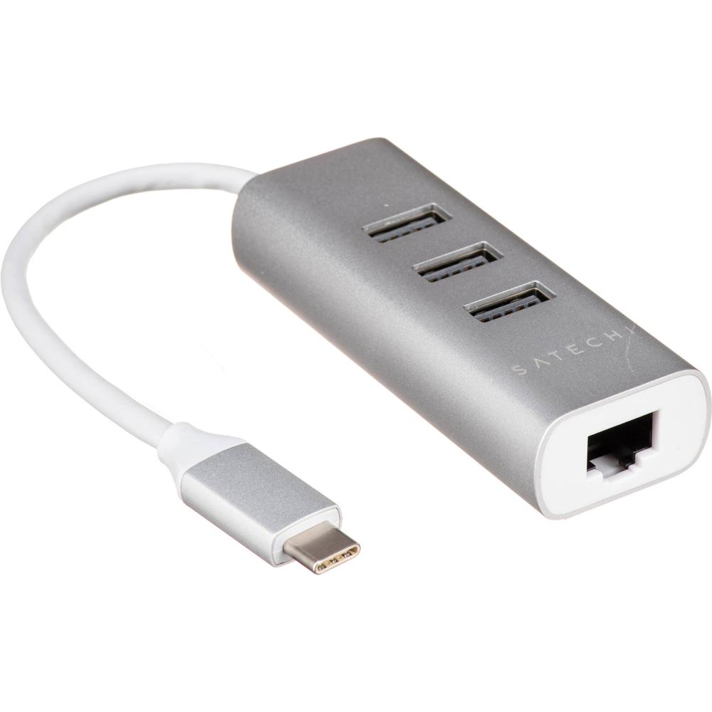 Satechi USB Type-C 2-en-1 Hub (Plata) - 3 Puertos USB 3.2 Gen 1 Type-A, Puerto Ethernet Gigabit, Luz