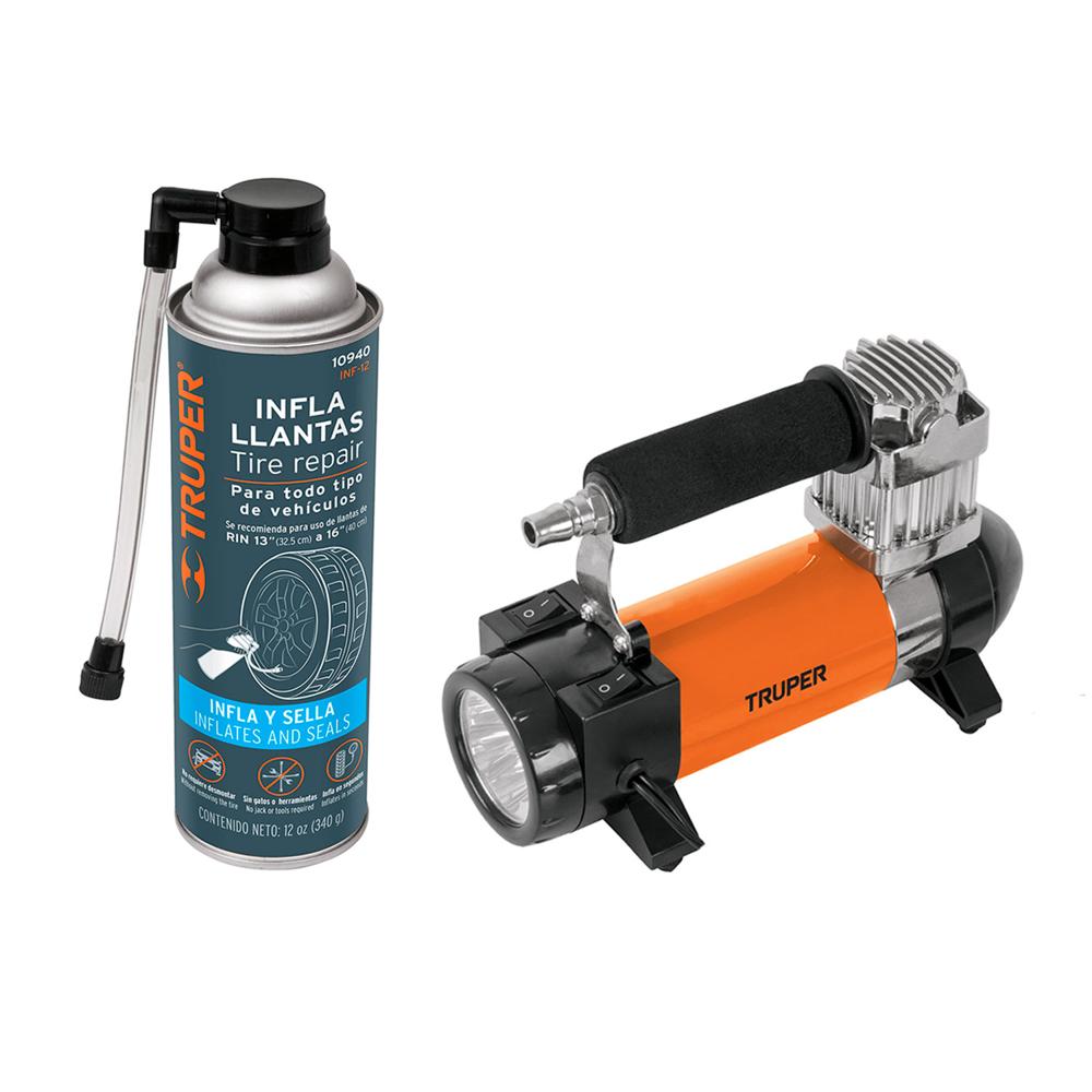 Sellador de Neumaticos Llanta 12oz Auto 10940 y Compresora de Aire 12v para Auto Infla 19999 Truper