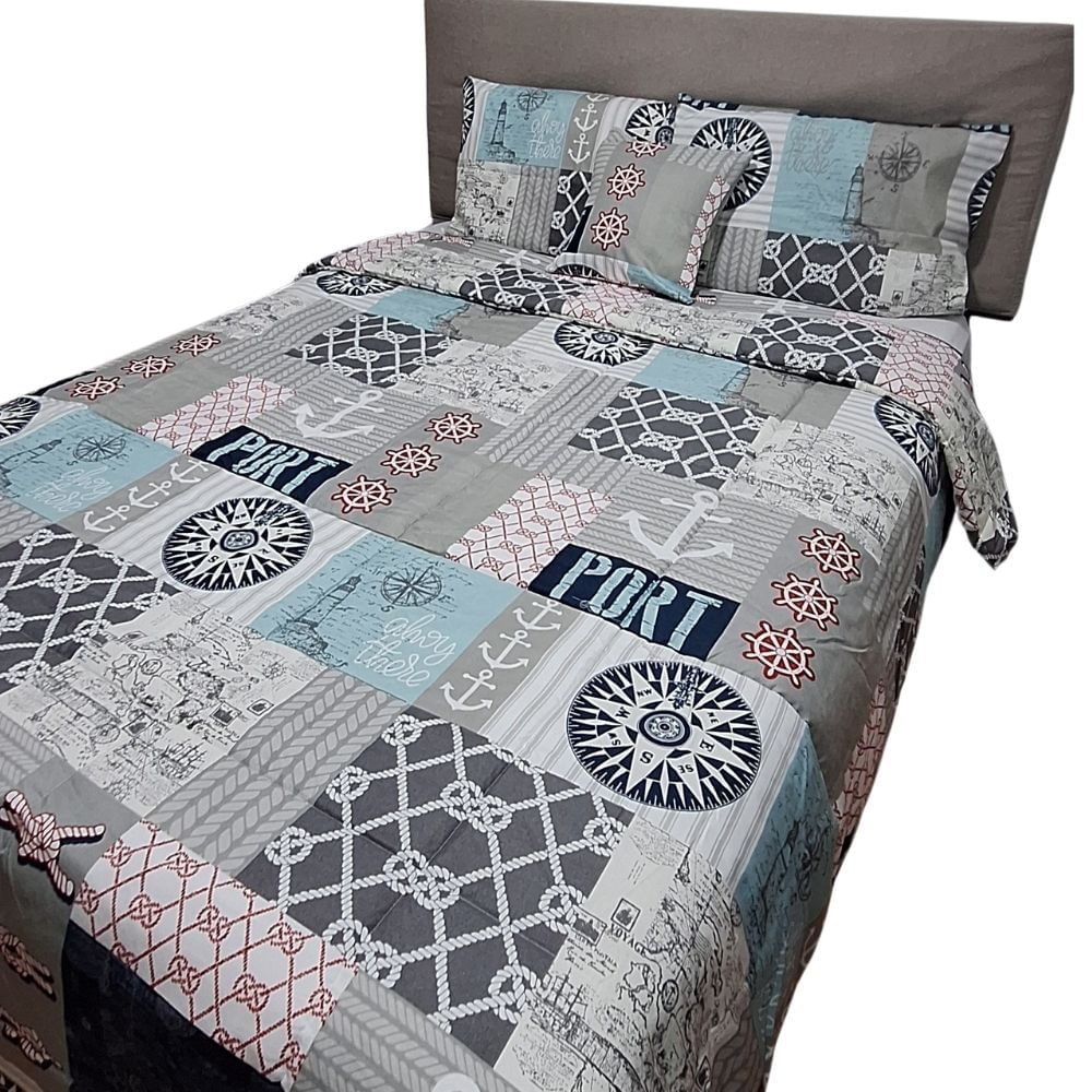 Set Edredón Lujo Celeste Naútica 2 Plazas Reversible + Set de Sábanas