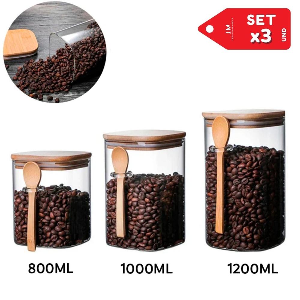 Set x3 Frascos de almacenamiento con tapa y cucharita estilo Bambú Cuadrado