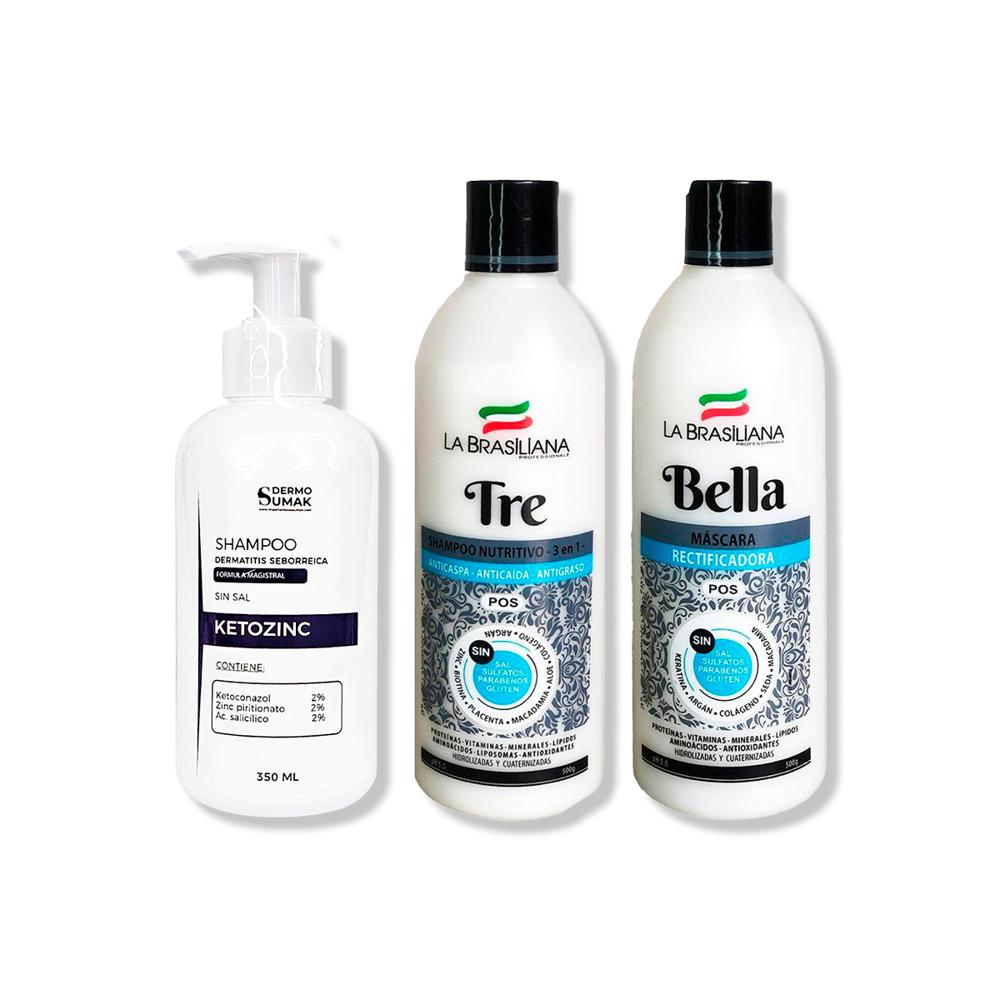 Shampoo Ketozinc 350ml + Shampoo Tre 500Gr + Mascara Bella 500Gr