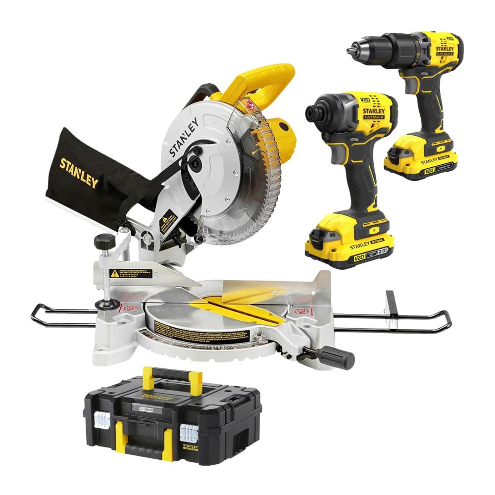 Sierra ingleteadora 10 plg, taladro percutor, atornillaor impacto 20V
