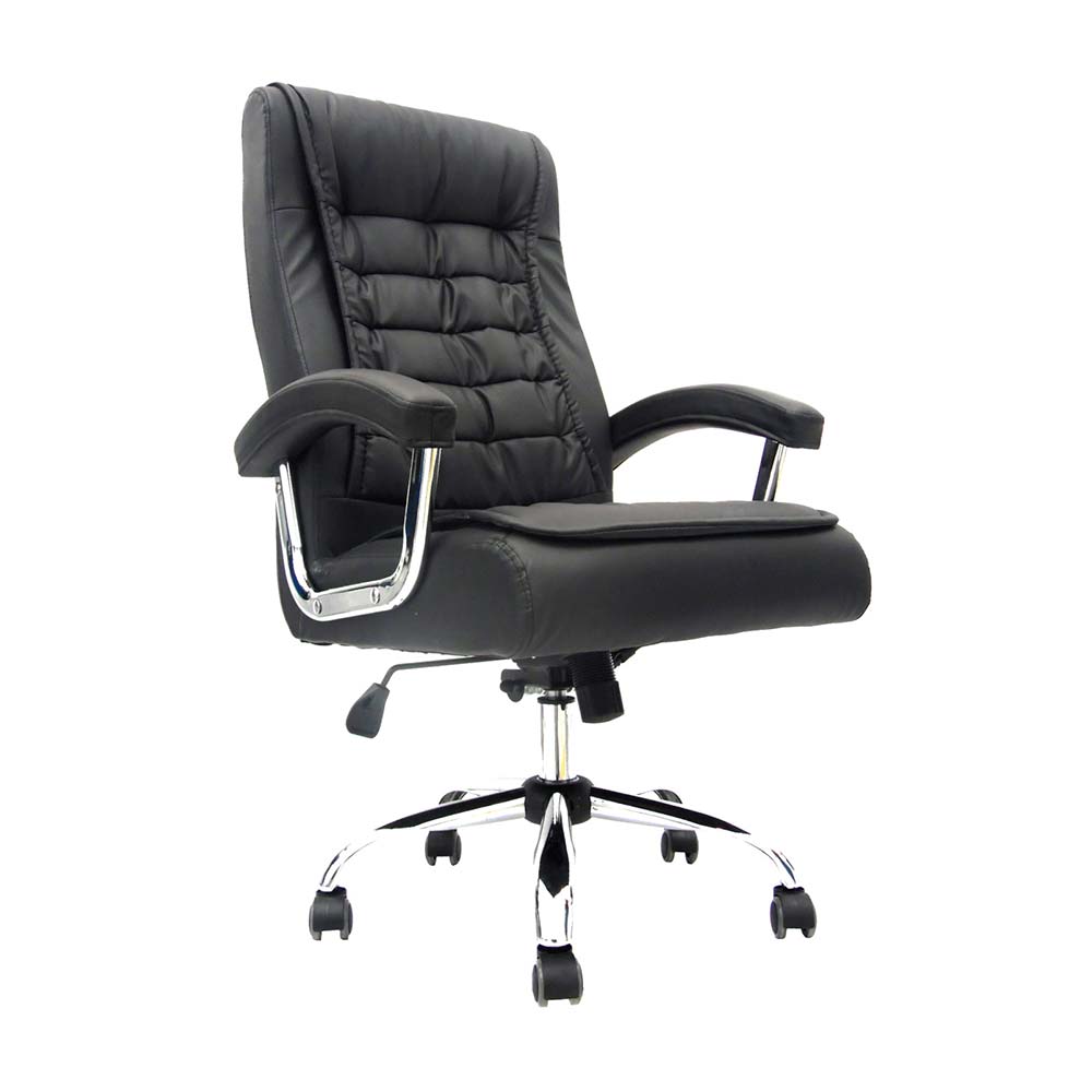 | Características | Las sillas para Oficina están pensados en brindarte comodidad y ergonomía para tus espacios. Cuentan con materiales resistentes y confortables que se adaptan a tus necesidades. Mecanismo: Varias posiciones de bloqueo, graduación de altura del asiento. Espaldar: Acolchado tapizado en cuerina. Asiento: Tapizado en cuerina con resortes y espuma importada. Brazos: Fijo tapizado en cuerina. Base: Cromada 70 cm. Ruedas: PU de 50 mm de diámetro. |
