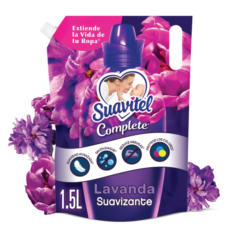 | Descripción del producto | Descripción del productoSuavizante El Nuevo Suavitel Complete Lavanda y su fórmula todo en uno, elimina los residuos de detergente, reduce drásticamente las arrugas y protege 3 veces más los colores*, dejando un delicioso aroma que perdura Beneficios: - Sin enjuague adicional. Menos uso de agua - Hasta un 40% Secado más rápido que usando sólo detergente - Garantiza una mayor y más agradable sensación de Suavidad en las prendas - Facilita el proceso de Planchado. 50% menos arrugas |