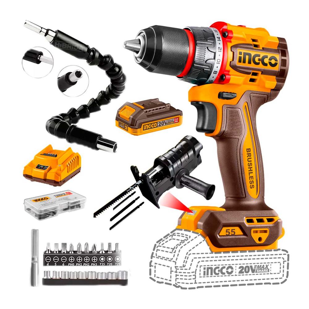 Taladro Inalámbrico 55nm 20v Brushless+ 21accs + Adaptador Caladora