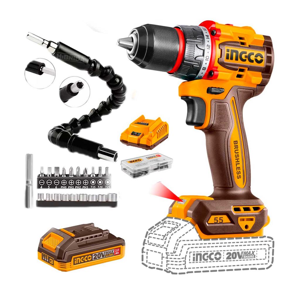 Taladro Inalámbrico 55nm Ingco 20v Brushless+ Extensor 21acs