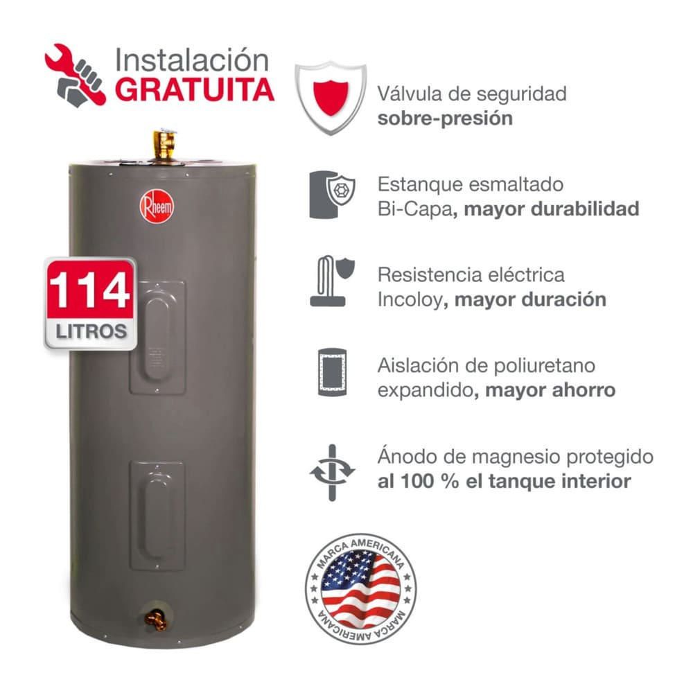 | Características | Estanque esmaltado de Porcelana Bi-Capa Rheemglas. Aislación de poliuretano expandido de alta densidad. Ánodo de Magnesio protegiendo al 100% el tanque interior. Posee 2 resistencias eléctricas de Incoloy de alta durabilidad. Sistema de auto limpieza patentado Everkleen. / Condiciones de Instalación: Condiciones necesarias:
