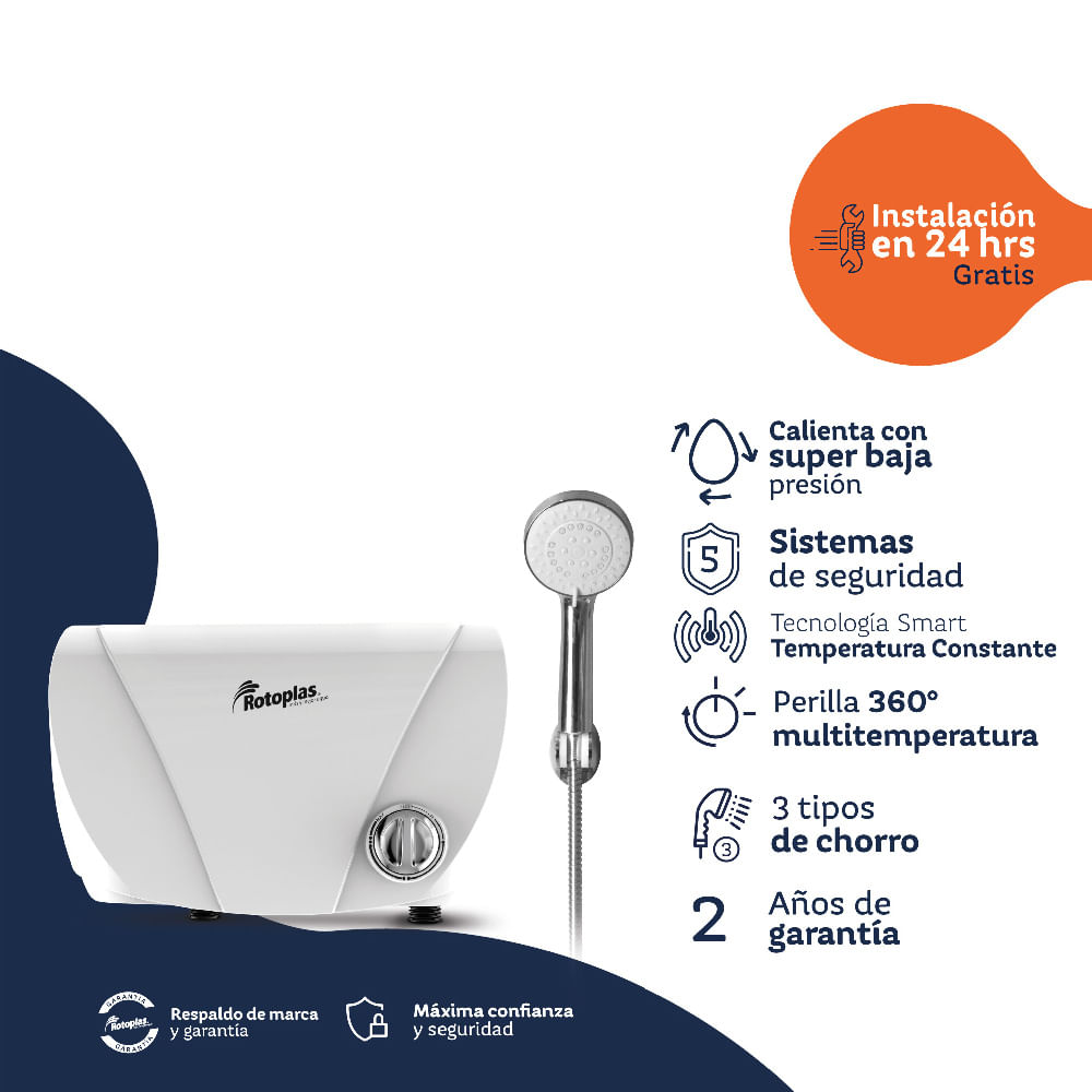 | Características | 'Solución compacta que asegura el calentamiento de agua instantáneo en 3-5 segundos tiene perilla de control de temperatura incluye accesorios de ducha |