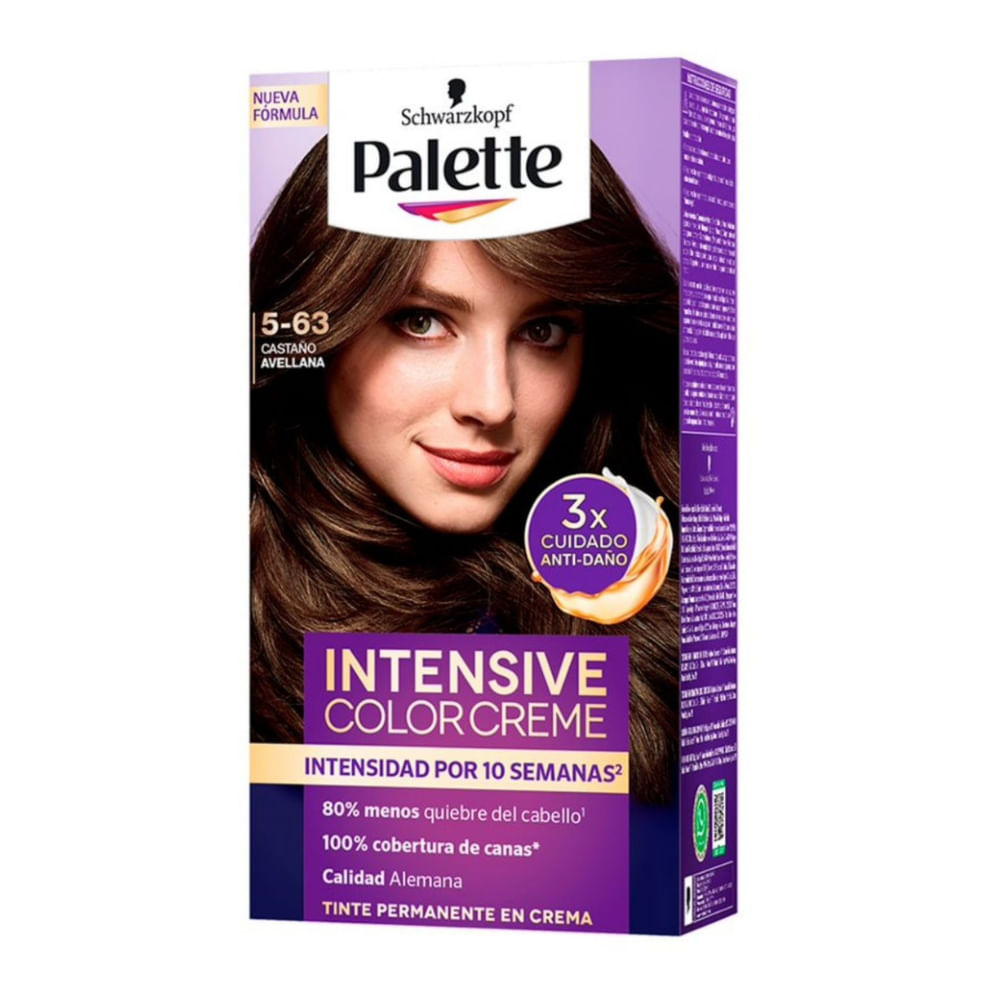 | Descripción del producto | Descripción del productoTinte PALETTE COLOR CREAM 5-63 Castaño Avellana Caja 170ml Palette Color Creme le trae color a tu vida gracias a sus colores intensos hasta por 10 semanas¹ y 100% cobertura de canas².