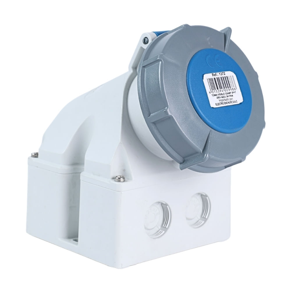 | Características | Toma visible tipo trifásico con línea a tierra, material de PVC y amaplast, cuenta con tapa, diseñado para trabajos industriales con una exelente resistencia a impactos y a una amplia variedad de productos químicos, ademas tiene un grado de proteccón contra el polvo y agua IP44. |