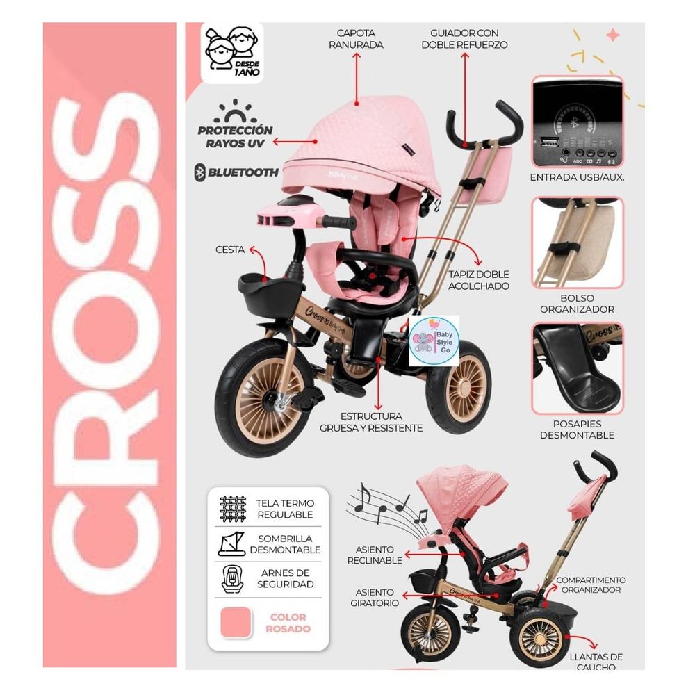 Triciclo Croos Asiento Giratorio Baby Bluetooth Rosado