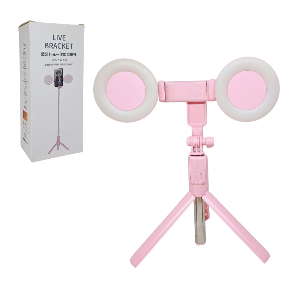 Trípode Selfie Stick Bluetooth Con 2 Aros Led Luz Calida Rosado