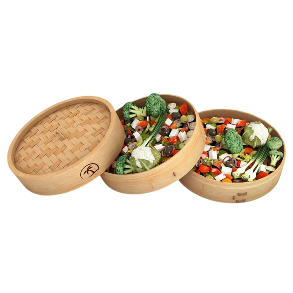Vaporera De Bambu de 2 Piso Con Tapa Asa 24cm diam 3pza