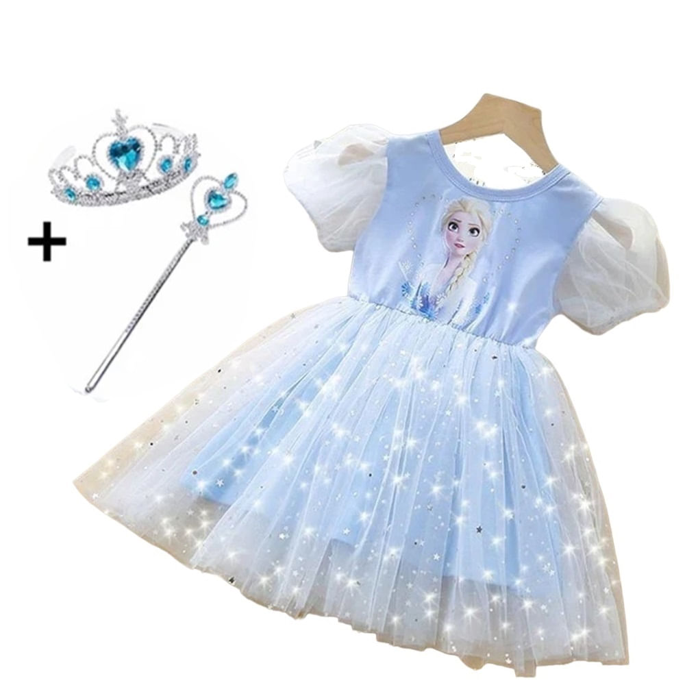 Vestido Niña Genieka Princesa Frozen + Varita +Diadema Manga Corta Fiesta Disfraz